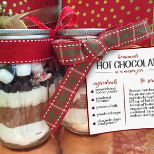 Hot Cocoa Labels ⋆ Real Housemoms Option Two: Print out the labels onto card stock, cut them out, punch a hole in the top of the label and with bakers twine or string, attach it to the jar itself and use it as a tag. Either way it will make an adorable gift. If you are giving out single serving gifts you will use a 4 oz mason jar and 1/4 C of hot cocoa mix.