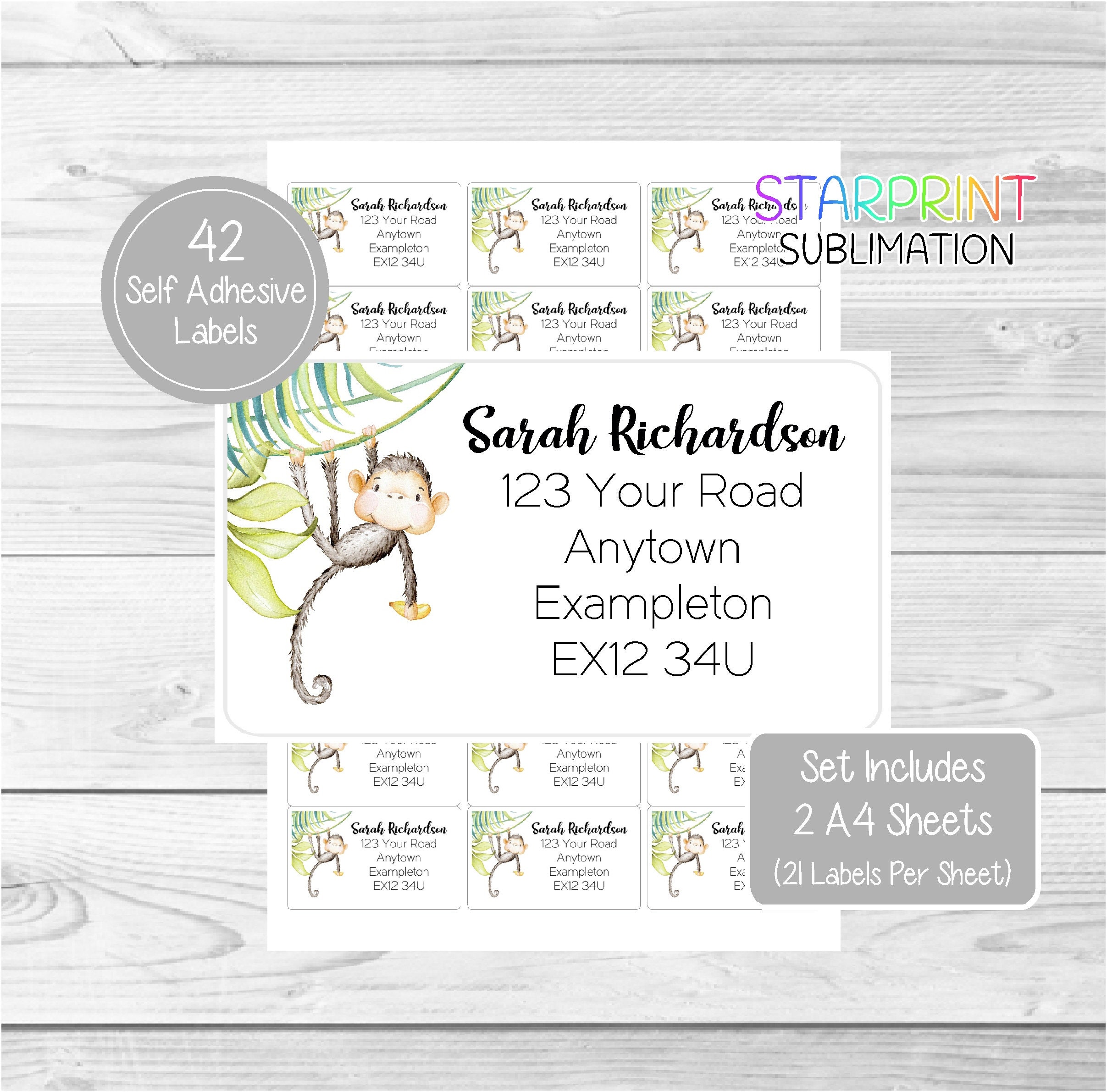Monkey Personalised Return Address Labels, 42 Custom Self Adhesive Stickers - Fun Novelty Set Includes 2 A4 Sheets (21 per sheet)